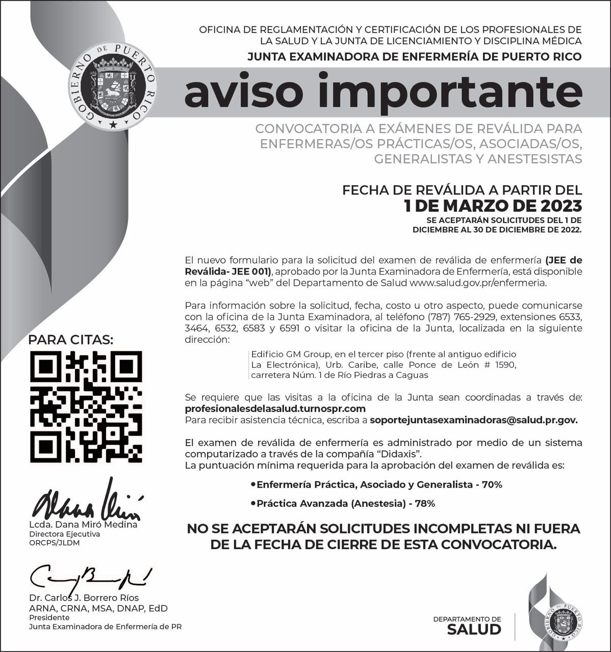 - Aviso Público: Convocatoria de Examen de Reválida de la Junta Examinadora de Enfermería de Puerto Rico (23 de febrero 2023 Vocero y Primera Hora)