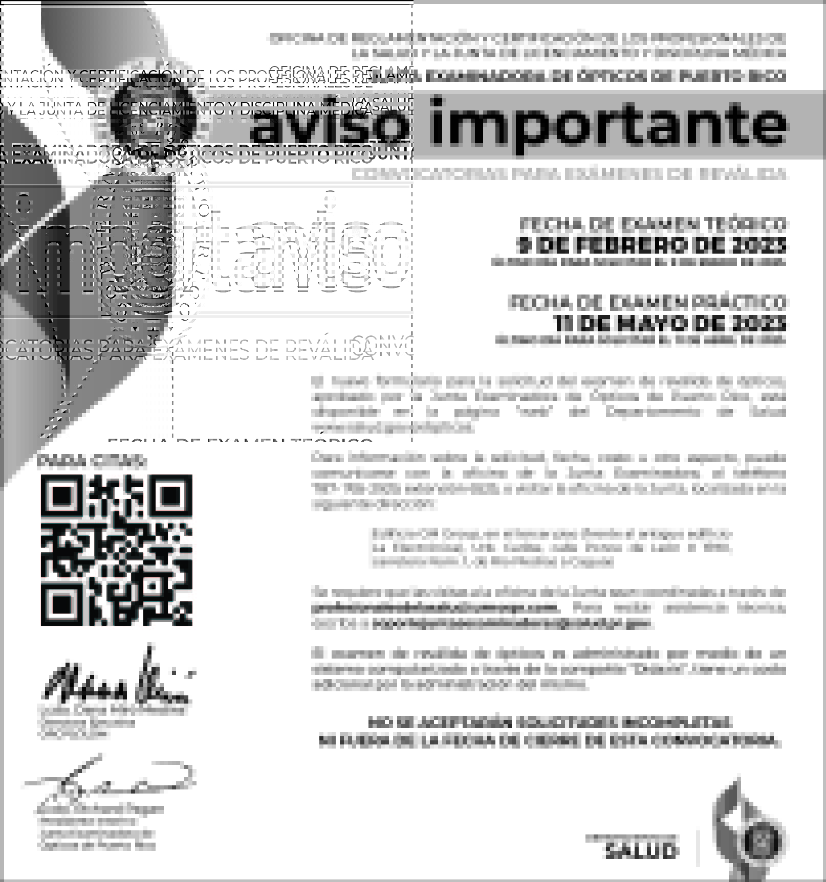 - Aviso público: Convocatoria a Examen de Reválida para Ópticos (13 de mayo 2025, El Vocero)