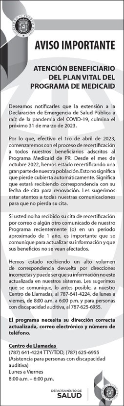 - Aviso Público: Medicaid, “Atención Beneficiarios del Plan Vital del Programa Medicaid” (14 de febrero 2023 Nuevo Día y Vocero)