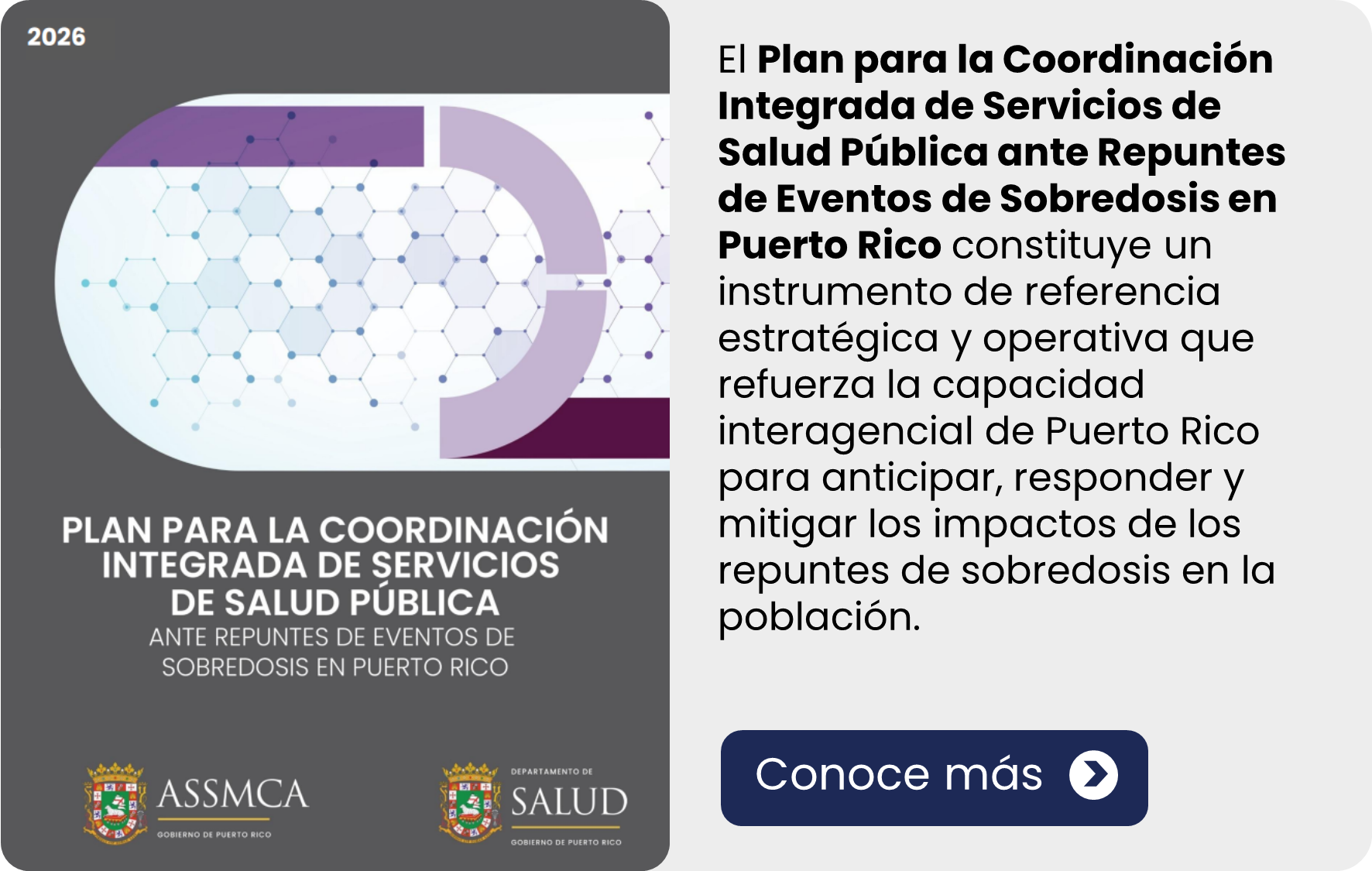 La División de Salud Pública para la Prevención de Sobredosis por Sustancias Psicoactivas es un esfuerzo de la Oficina de Planificación y Desarrollo del Departamento de Salud de Puerto Rico. Busca responder de forma acertada, efectiva y equitativa la situación de opioides y sustancias en Puerto Rico desde una perspectiva multidisciplinaria, salubrista y colaborativa. A través de sus esfuerzos, pretende comprender dicha situación mediante la recopilación, análisis y diseminación de datos e información relevante. Esto, con el fin de atender las necesidades de la población, así como establecer e implementar estrategias contextuales y salubristas que propicien la mitigación de la situación de opioides y sustancias en la Isla.