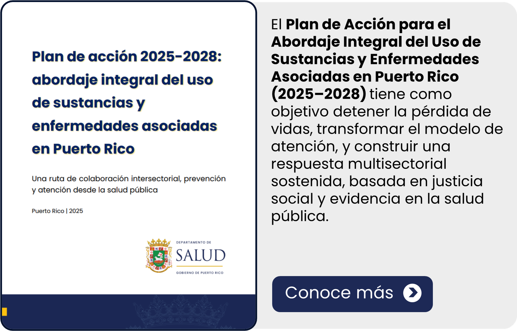 Con un enfoque en los determinantes sociales de la salud, la División busca fortalecer la vigilancia, prevención, educación y apoyo comunitario en temas de opioides y sustancias. De igual forma, busca promover la toma de decisiones e implementación de iniciativas informadas por la evidencia. Esto, propiciando el desarrollo de política pública que tome en consideración las dimensiones biopsicosociales y de derechos humanos inherentes a todas las personas.